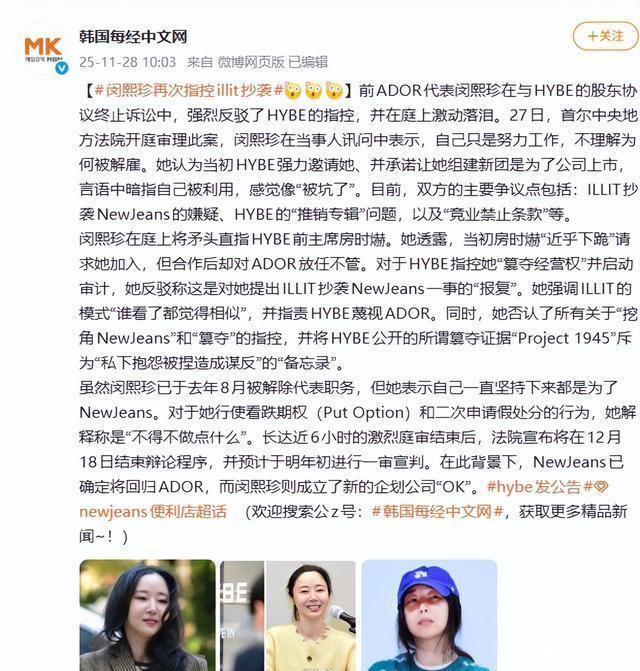 一场从“创意抄袭”吵到“亿万赔偿”的连环宫斗 2024年4月,一场新闻发布会上,ADOR前代表闵熙珍站在镜头前,声泪俱下地指控HYBE抄袭NewJeans的“创意DNA”,说公司不给资源、不当人,对待她们就像对待工厂流水线上的塑料娃娃。 这番言论迅速点燃了舆论,“保护艺人”“资本剥削”的标签贴满了网络。闵熙珍一夜之间成了“反资本斗士”,HYBE则被打成“娱乐圈黑心东家”。 但很快,剧情反转。