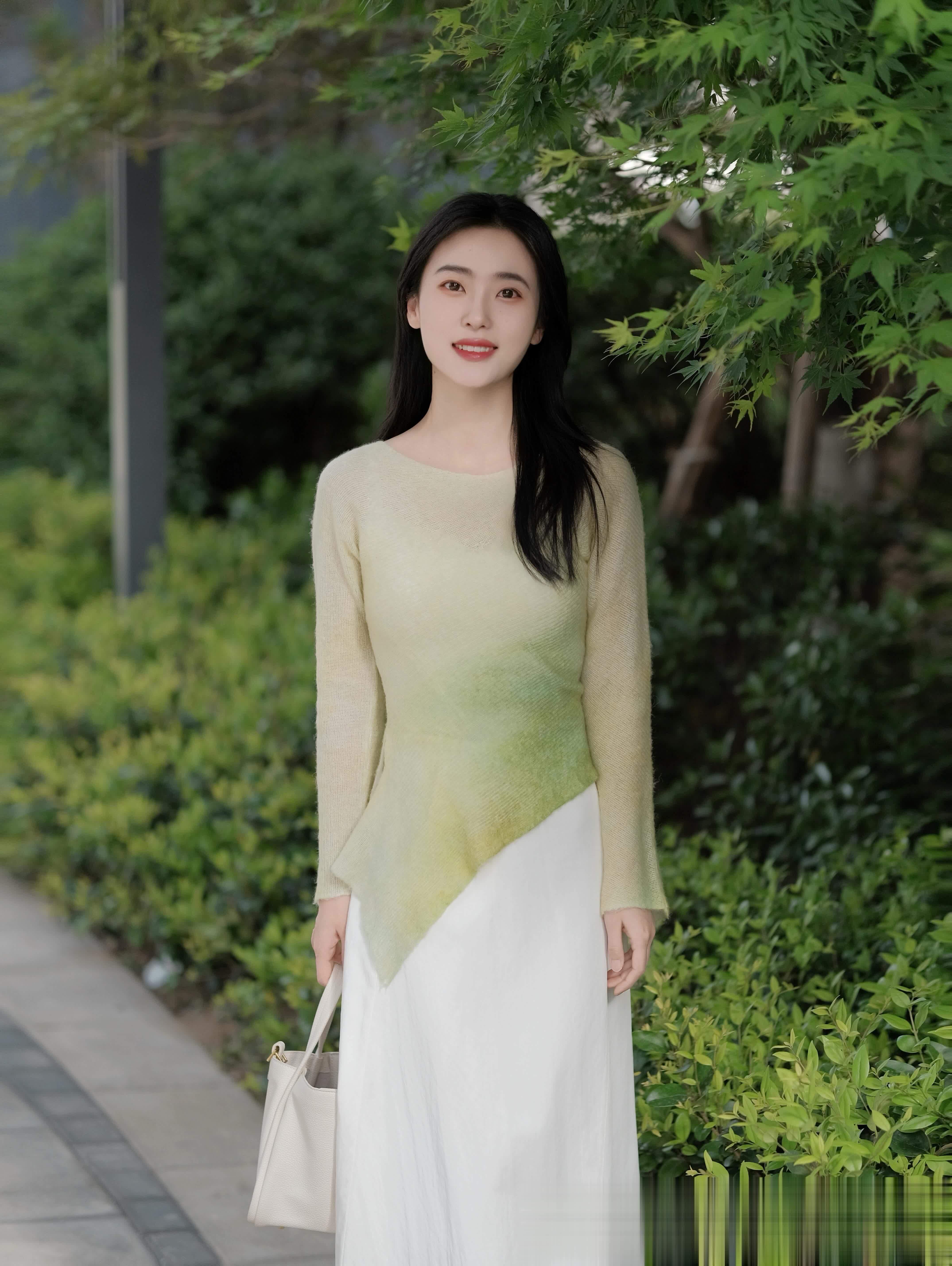 午间偷闲,踏入楼下的葱郁绿意。淡绿渐变的针织衫,宛如将春天穿在身上,与纯白长裙的清新相得益彰。手提白色方包,漫步石板小径,对镜头展露温婉笑容。身后灌木葱茏,阳光透过叶隙洒下光斑。这身搭配,是忙碌日程里的清新深呼吸,提醒自己在快节奏中,为心情留一片绿洲。