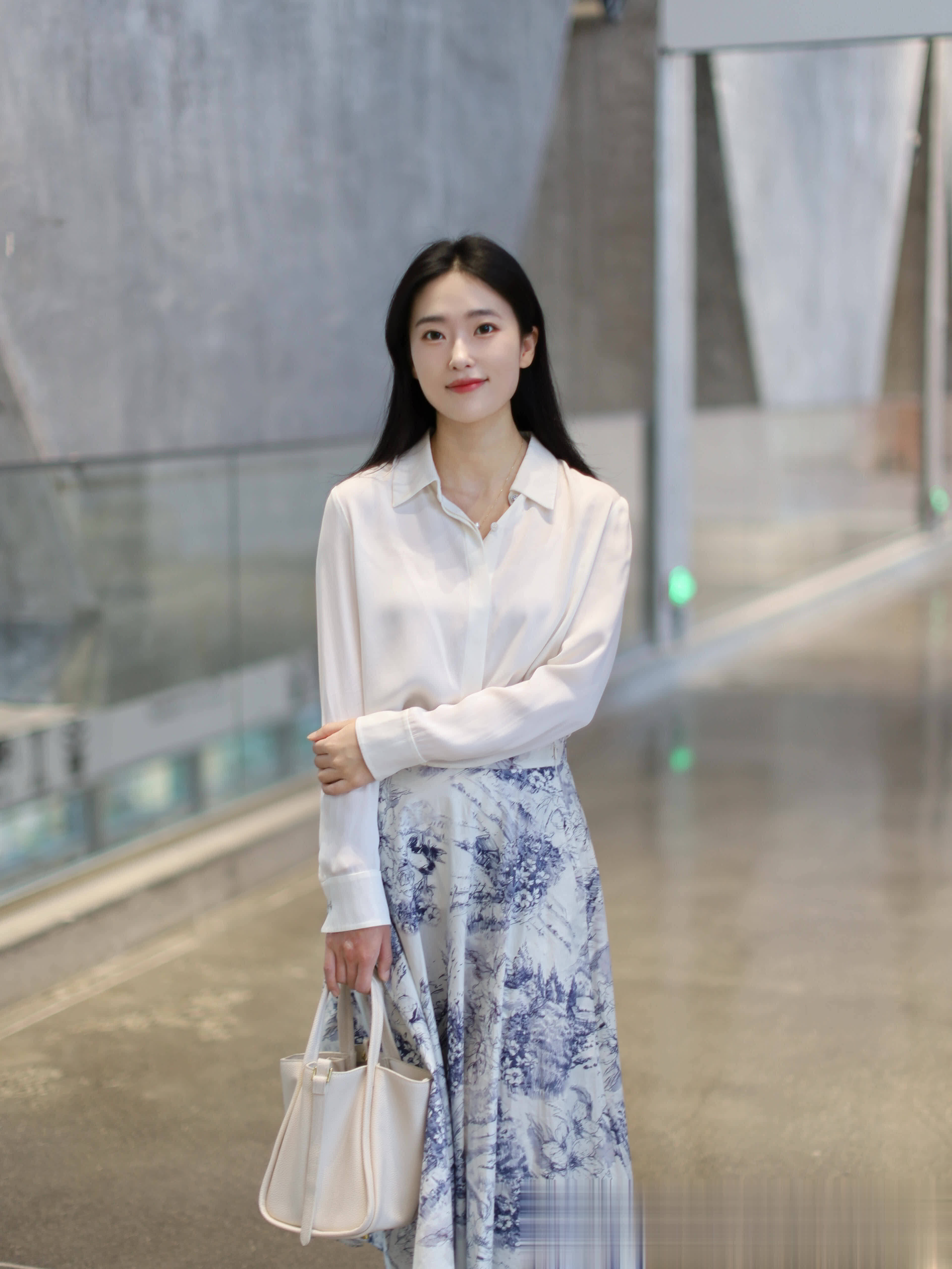 暂别数据的繁杂,于玻璃幕墙的倒影中觅得静谧。白衬衫利落挺括,如职业的坚固铠甲;蓝白晕染的山水印花长裙,恰似内心流淌的诗意画卷。轻提米白手袋,侧身而立,目光沉静。远处光影在墙面交织成画,此刻的优雅,是在严谨工作中坚守的精神桃源,尽显知性温婉。