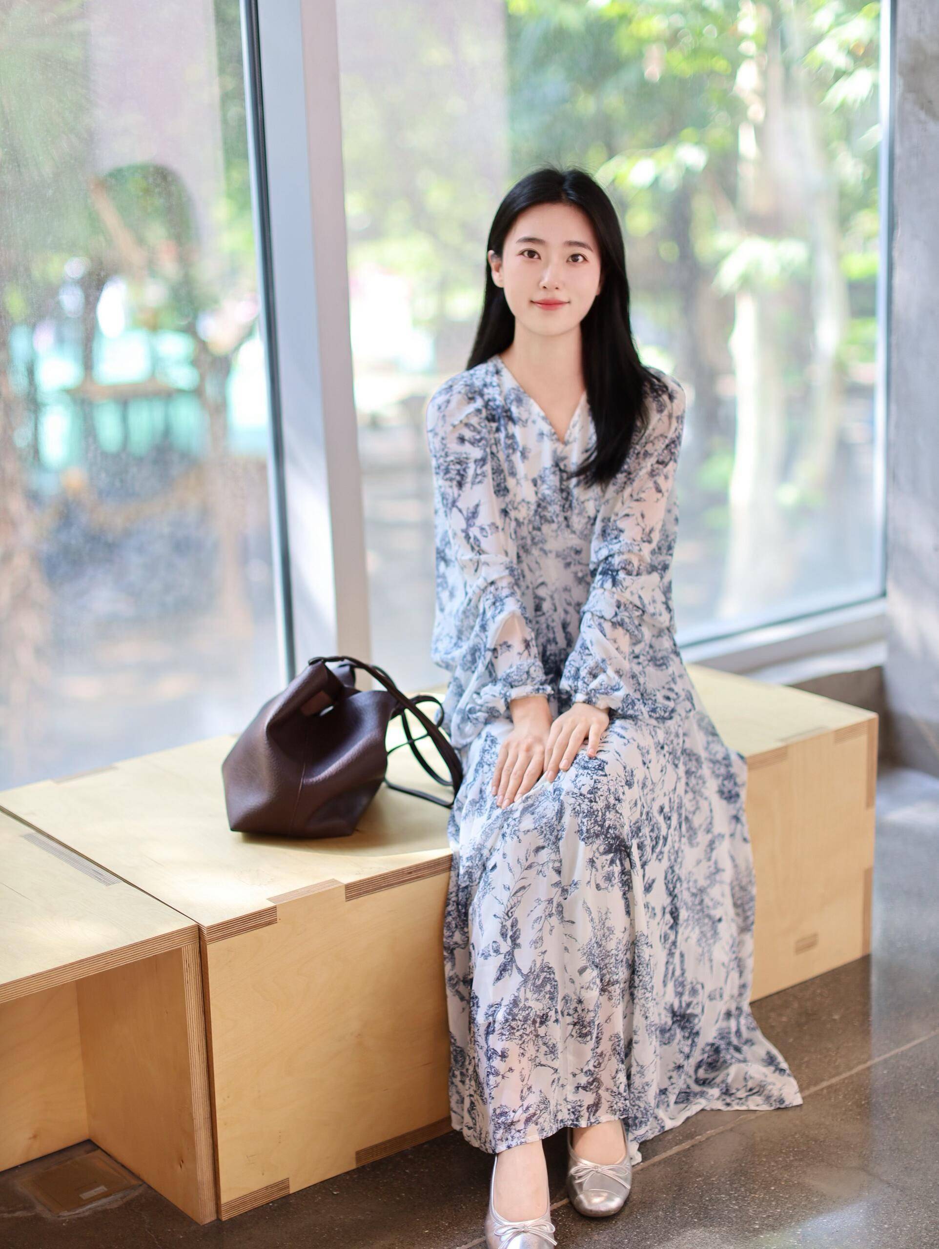 大面积玻璃窗引入满室天光,与蓝白印花连衣裙相得益彰。V 领与喇叭袖设计保留浪漫,端坐木质长凳,双手交叠,笑容温婉。身旁深棕色水桶包弧度随性。窗外绿意朦胧为背景画,这身装扮诠释 “轻松的精致”,让自己与观者皆感惬意。
