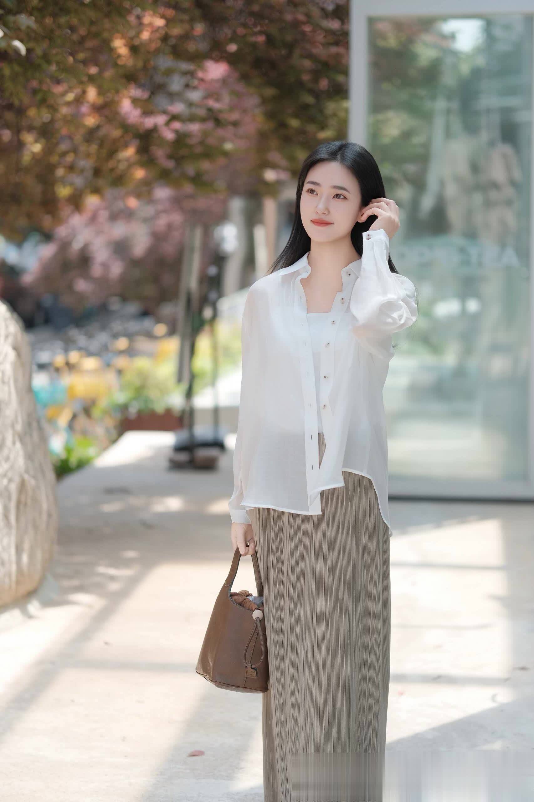 在需要灵感迸发的午后,宽松白衬衫与浅灰百褶阔腿裤,成为思维的舒适容器。手提棕色大包,仿佛装满亟待梳理的创意。站在明亮光区,一手轻拂长发,身后粉绿相间的树叶与建筑玻璃光影交织。这身打扮诠释了 “轻松的精致”,给予身体自由,让灵感肆意涌动。