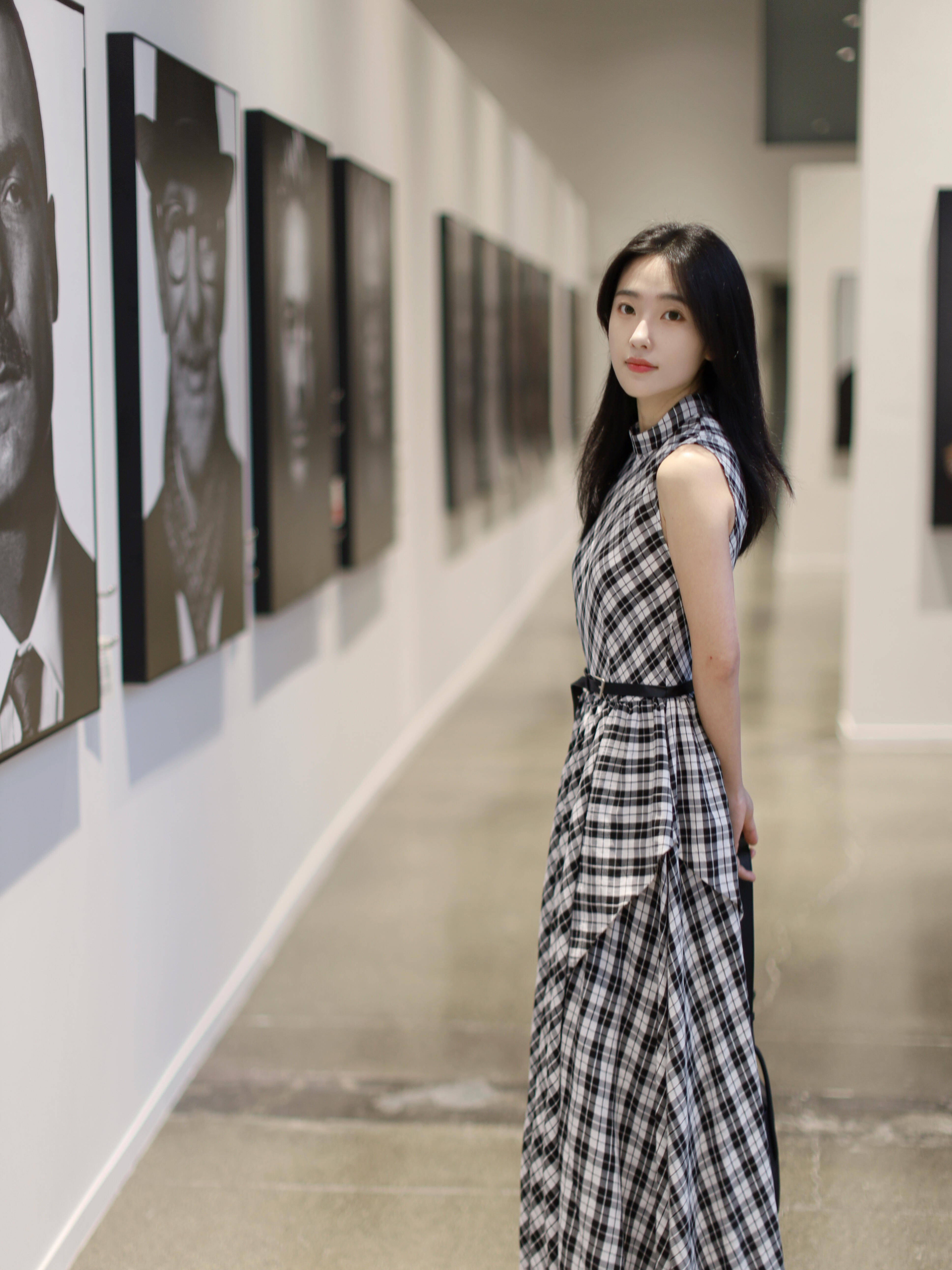 步入展厅,寂静被脚步轻叩。黑白格纹无袖连衣裙,以几何语言与墙上黑白肖像对话。黑色腰带系出清晨利落,长发垂落,侧影沉静。水磨石地面倒映顶灯与身影,延伸出思索的世界。在此,穿搭成为展览的一部分,理性优雅,带着专注之美。