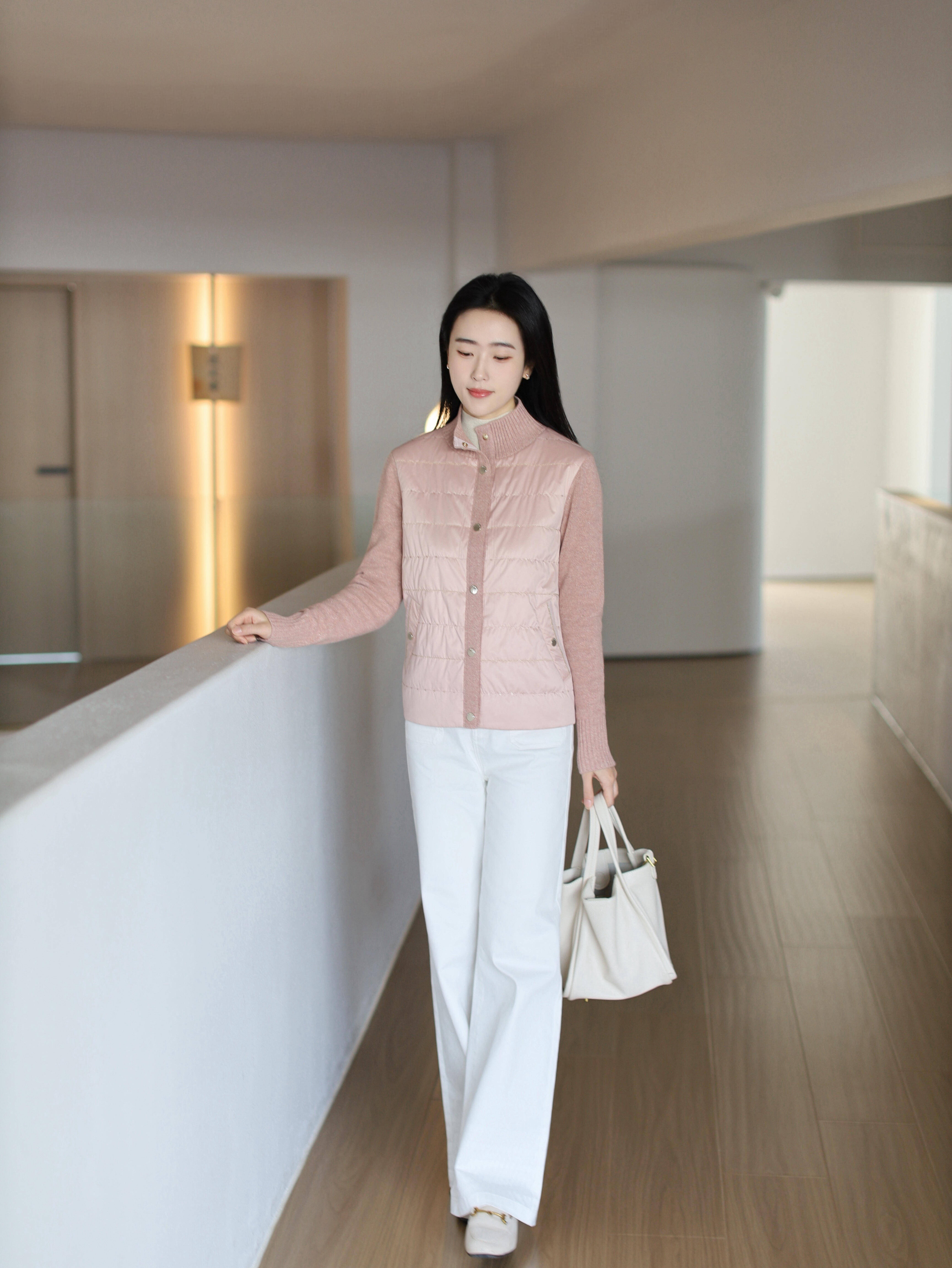 在光线柔和的室内走廊,倚着白色栏杆。浅粉色立领马甲与针织衫叠穿,散发午后软糯暖意,白色阔腿裤如云朵舒展。手提方正白包,低眉垂目,耳畔黑点轻晃。身后木门温润、墙面洁净,世界慢了下来。这身装扮无关效率,只关乎在繁忙中与内心宁静温柔相拥。