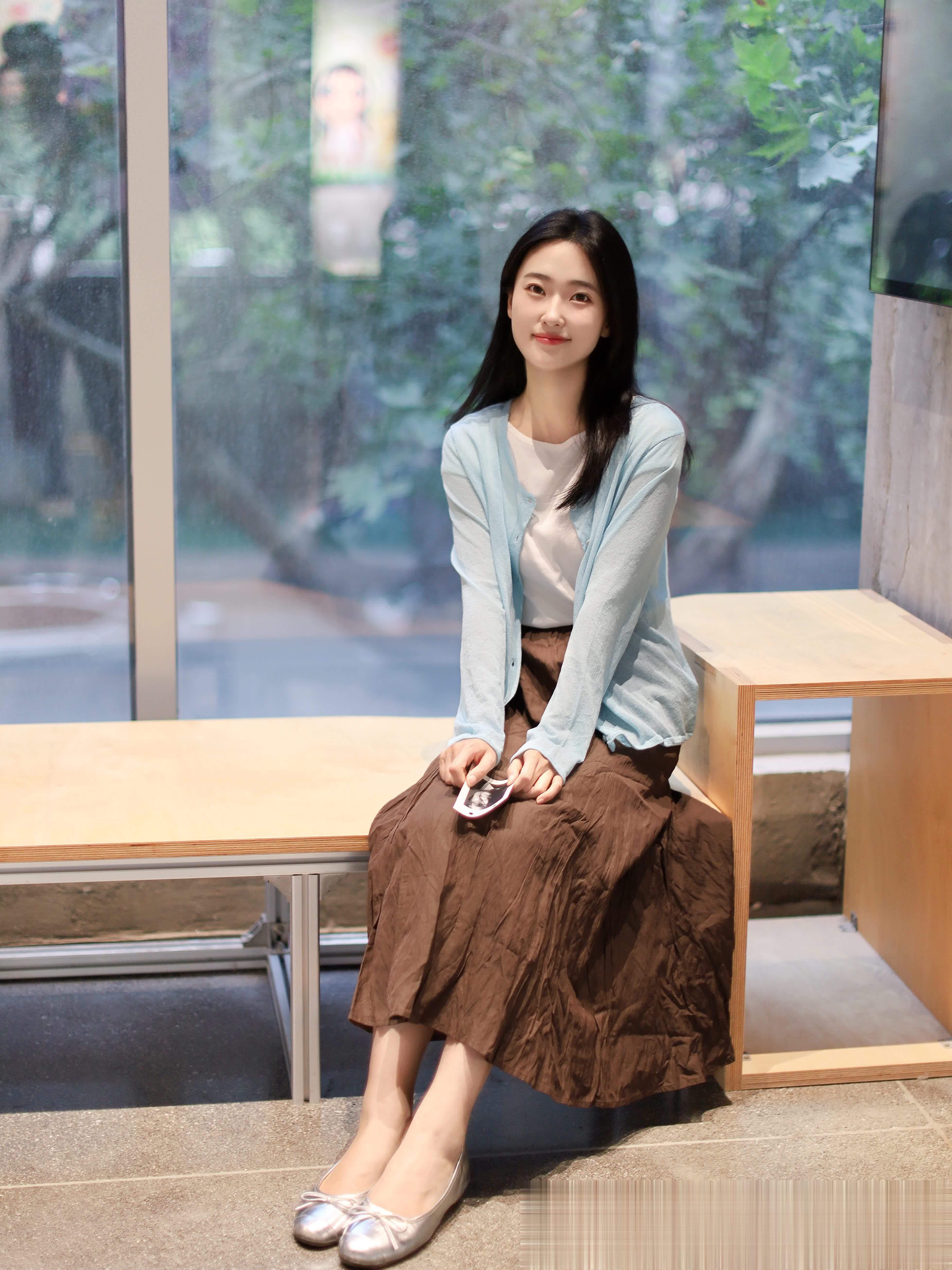 在满窗绿意环绕中,浅蓝色针织开衫与内搭连衣裙的蓝色系细腻对话。坐在木箱上,银色平底鞋微光闪烁,米白手提包简约雅致。阳光明亮柔和,洒落肩头发梢。即便窗外秋冬,心中仍存春日繁花原野。