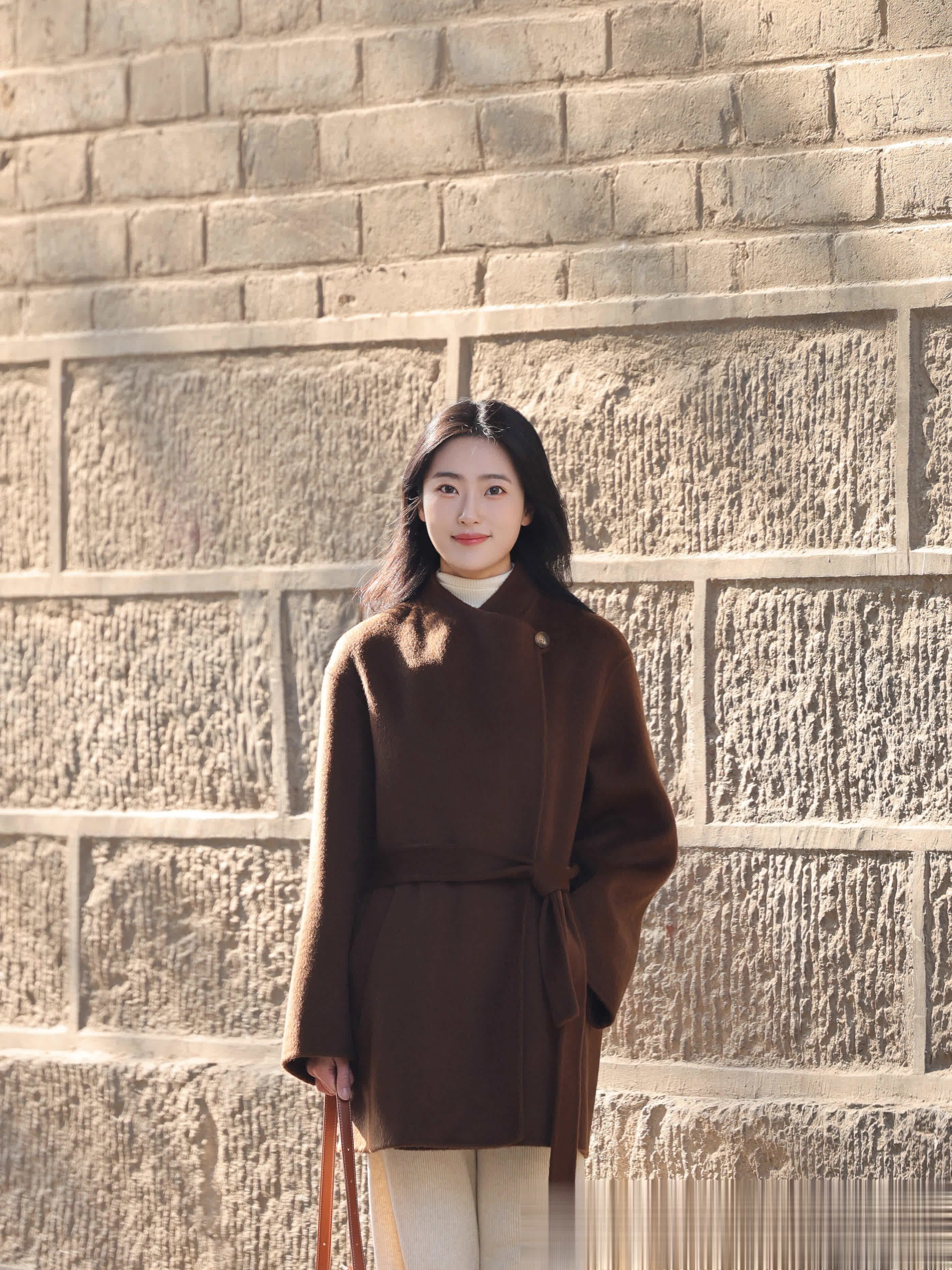 晨光初照,一件剪裁精良的棕色长大衣,宛如沉稳的乐章,奏响一日的序曲。羊绒质地轻柔包裹,同色系腰带轻束,利落曲线自然勾勒。内搭米白高领衫,暖意犹存,浅色长裤迈出从容步伐。手提棕色软皮包,站于古朴砖墙前,身后时光纹理相伴。这身装扮仿佛在宣告:哪怕今日征途繁忙,我自从容就位。