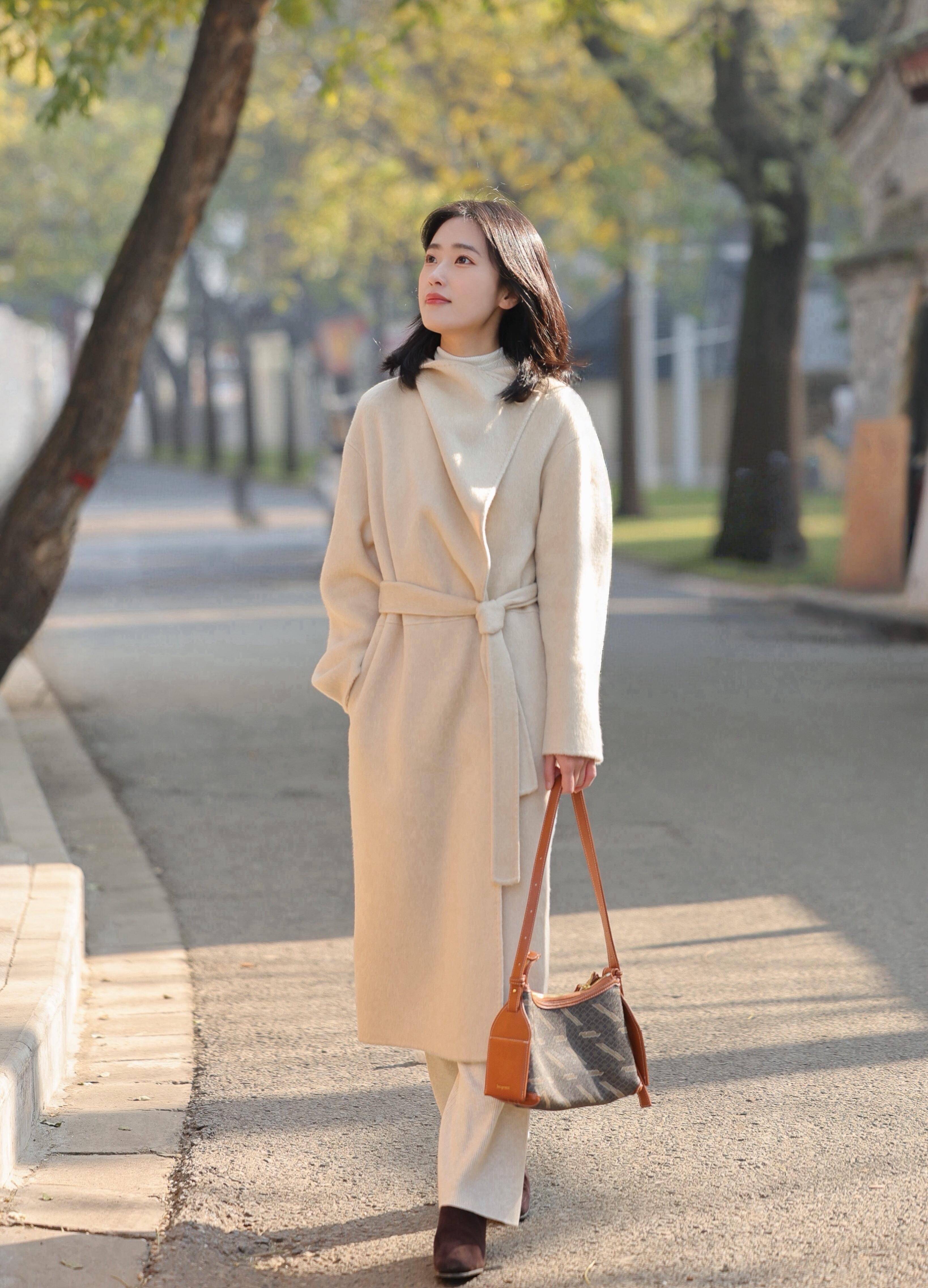 米白色长款大衣束腰勾勒利落轮廓,浅色阔腿裤与棕色短靴踏出飒爽步伐。手提装饰独特的包袋,侧头望向黄绿树叶的远方。街景虚化,道路延伸。这身搭配集秋日飒爽与温柔于一身,象征一段行程结束,预示新旅程开始,从容温暖,充满希望。