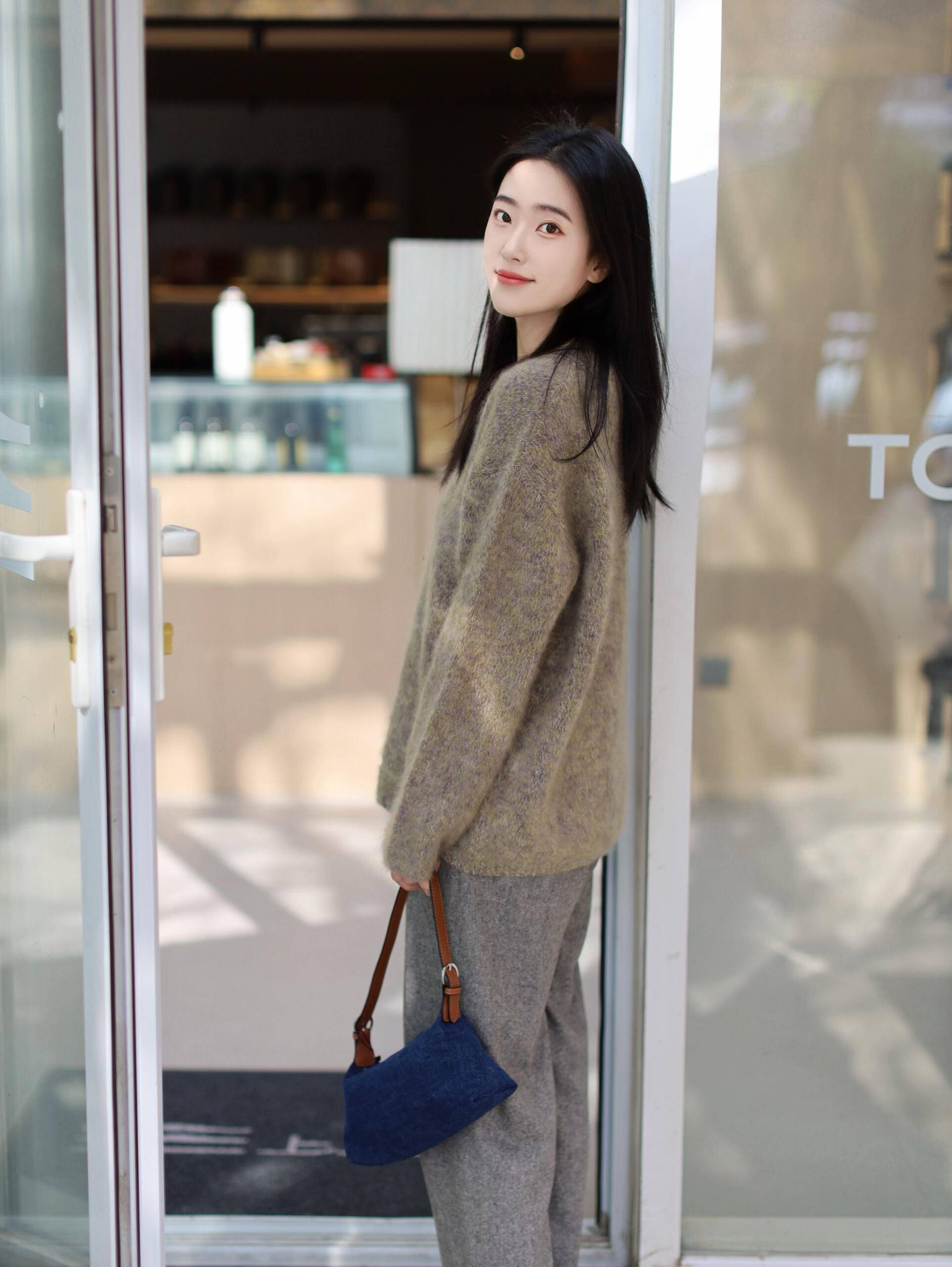 站在写着 “#TO” 的玻璃门前,宛如身处两个世界交界。浅棕色绞花毛衣蓬松温暖,灰色休闲裤与深蓝小包带来日常轻松韵律。微笑望向某处,身后室内灯光晕染成暖黄背景。这身搭配似温暖邀请,适合在寒凉时推门而入,于咖啡香中静享时光。