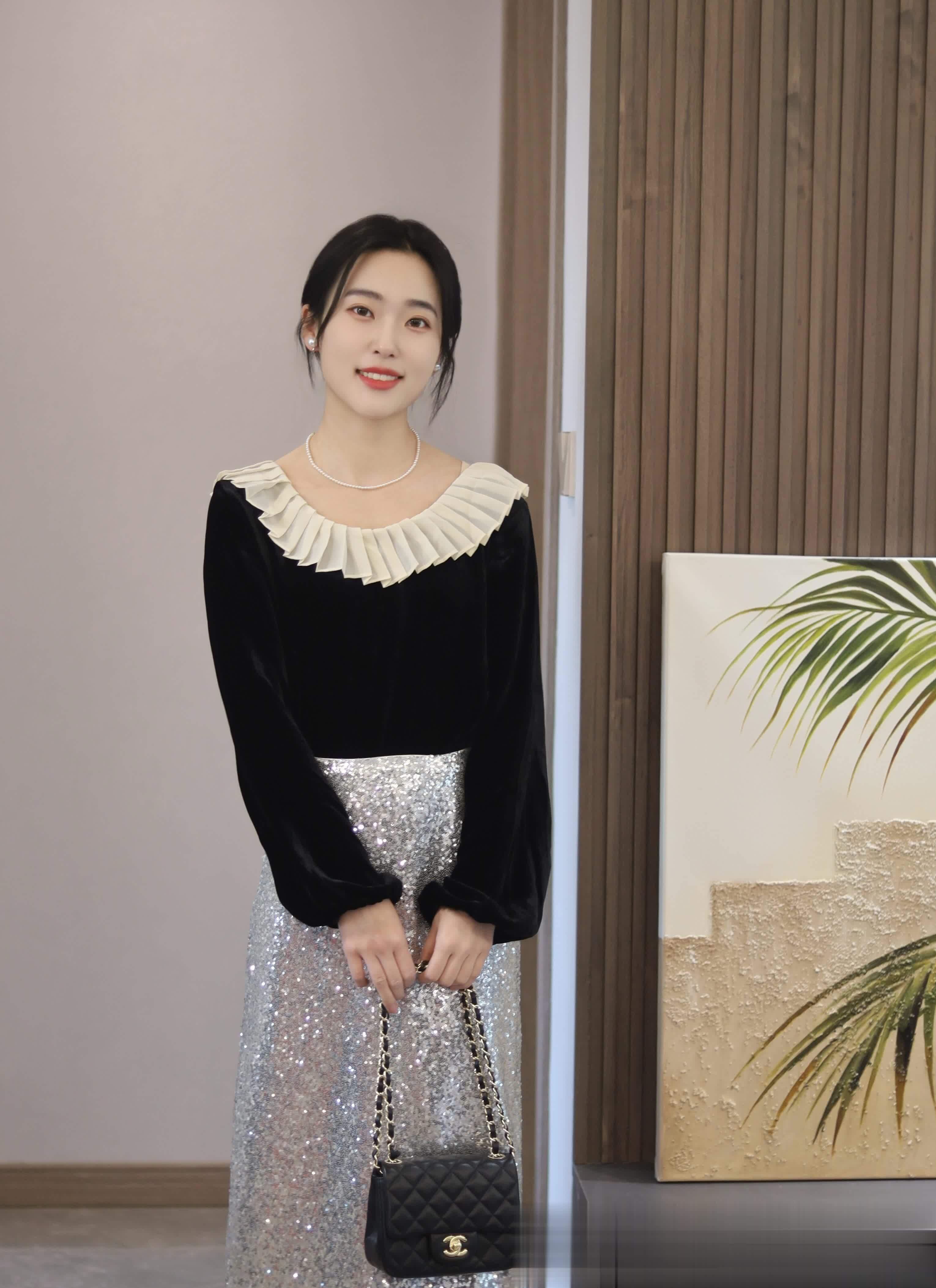 夜幕降临,城市换上华服,通勤穿搭也步入精致篇章。黑色天鹅绒上衣矜贵典雅,领口白色褶皱点亮浪漫,银色亮片长裙似星河倾泄,行走间光华闪烁。耳畔与颈间的精致装饰,是低调的魅力宣言。手持链条小包,站在静谧背景前,专业与女性魅力于此完美融合。