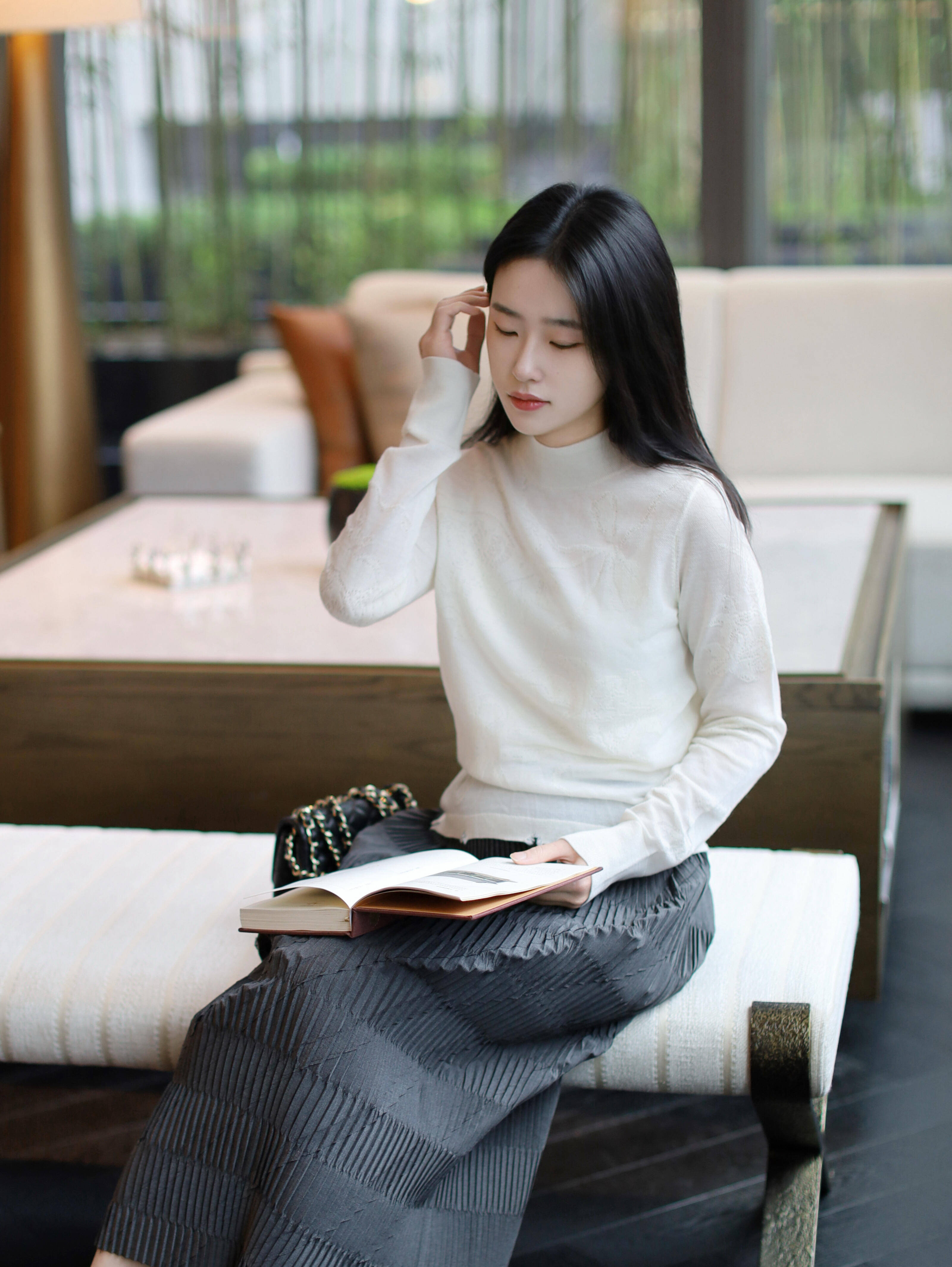 一日将尽,归家前稍作停留。柔软的白毛衣搭配深灰色肌理感褶皱阔腿裤,是卸下盔甲后的温柔展现。斜倚白色长椅,一手托腮,手边放着翻开的书与链条包。窗外绿意朦胧成背景。这身装扮是通勤日的优雅句点,融入生活场景,传达着认真工作、温柔生活的态度。
