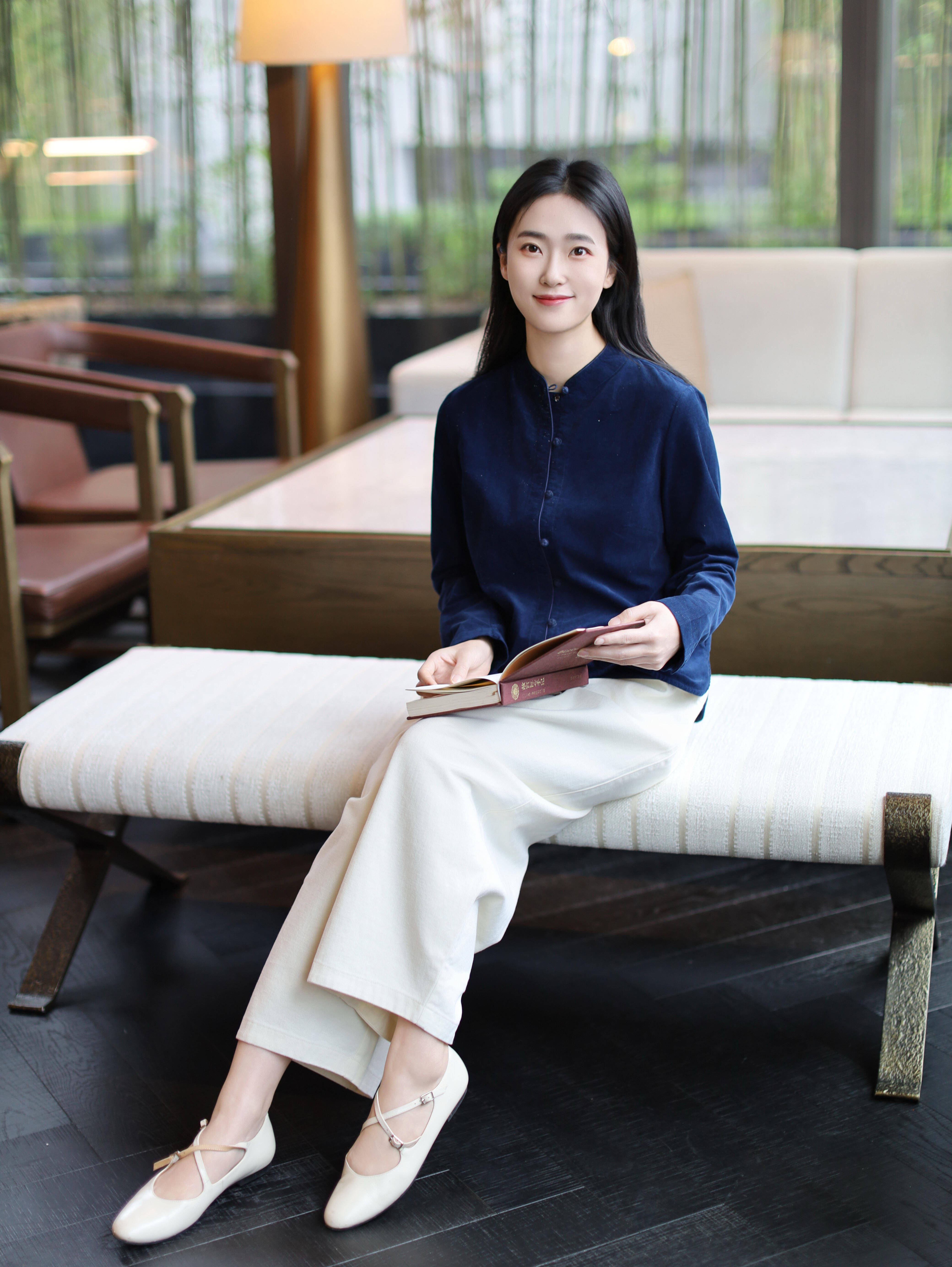 于咖啡馆角落,借阅读充实自我。深蓝色立领毛衣散发沉静书卷气,搭配米白色阔腿裤与平底鞋,舒适如同第二层肌肤。手捧书卷,笑容温婉,落地灯洒下柔和光晕。背景中沙发与绿植勾勒惬意轮廓。此刻,穿搭助力深入的心灵对话,展现职场女性不断成长的魅力。