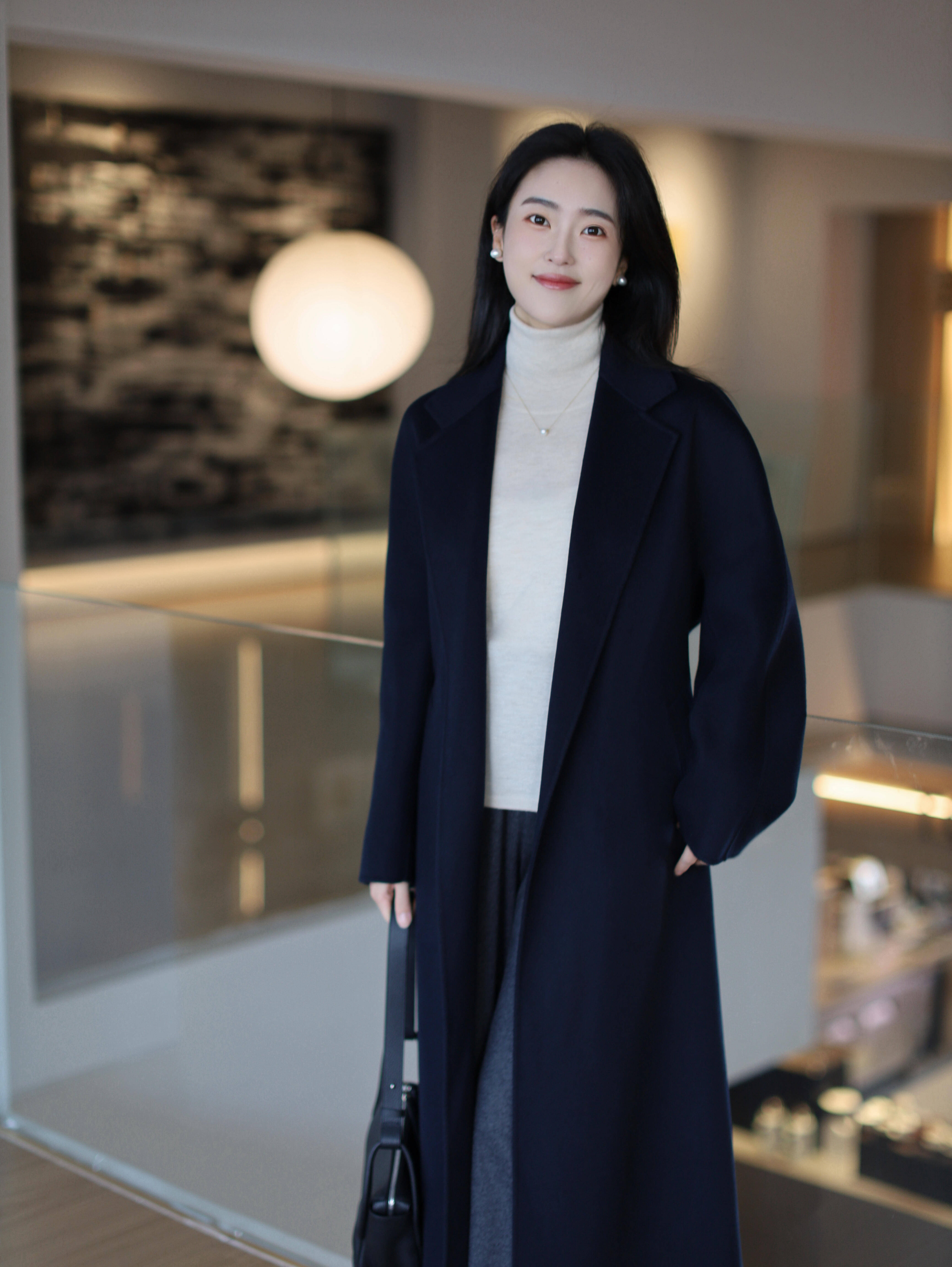 日光褪去,华灯初上,通勤叙事转入沉静章节。深蓝色长款大衣如夜色中的稳重诗行,内搭米白高领毛衣提亮气色,深灰长裙垂落优雅褶皱。珍珠耳钉与细项链似暗处星芒。手提黑色包袋,立于圆形光晕的艺术墙前,姿态从容,尽显历经繁忙后的优雅体面。