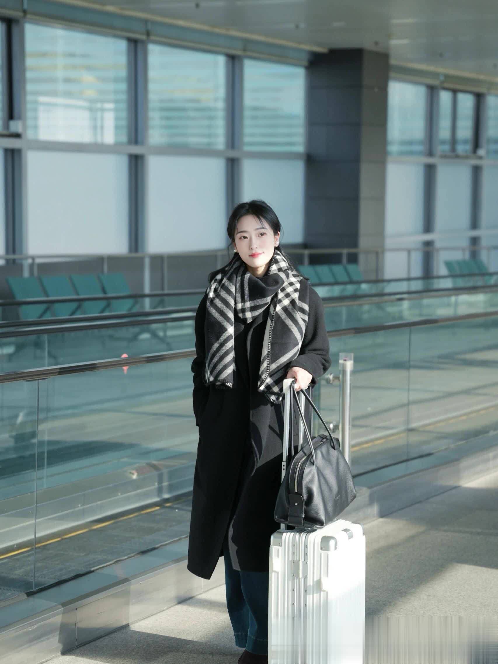 在车站或机场的玻璃长廊下,阳光为身影镀上金边。黑色长大衣是永恒的旅途伴侣,黑白格纹围巾增添英伦文艺气息。蓝色牛仔裤与黑色短靴保障长途舒适,一手提包,一手拉着白色行李箱。这身搭配实用耐看、气场十足,仿佛诉说着:无论目的地何方,我都能从容抵达。