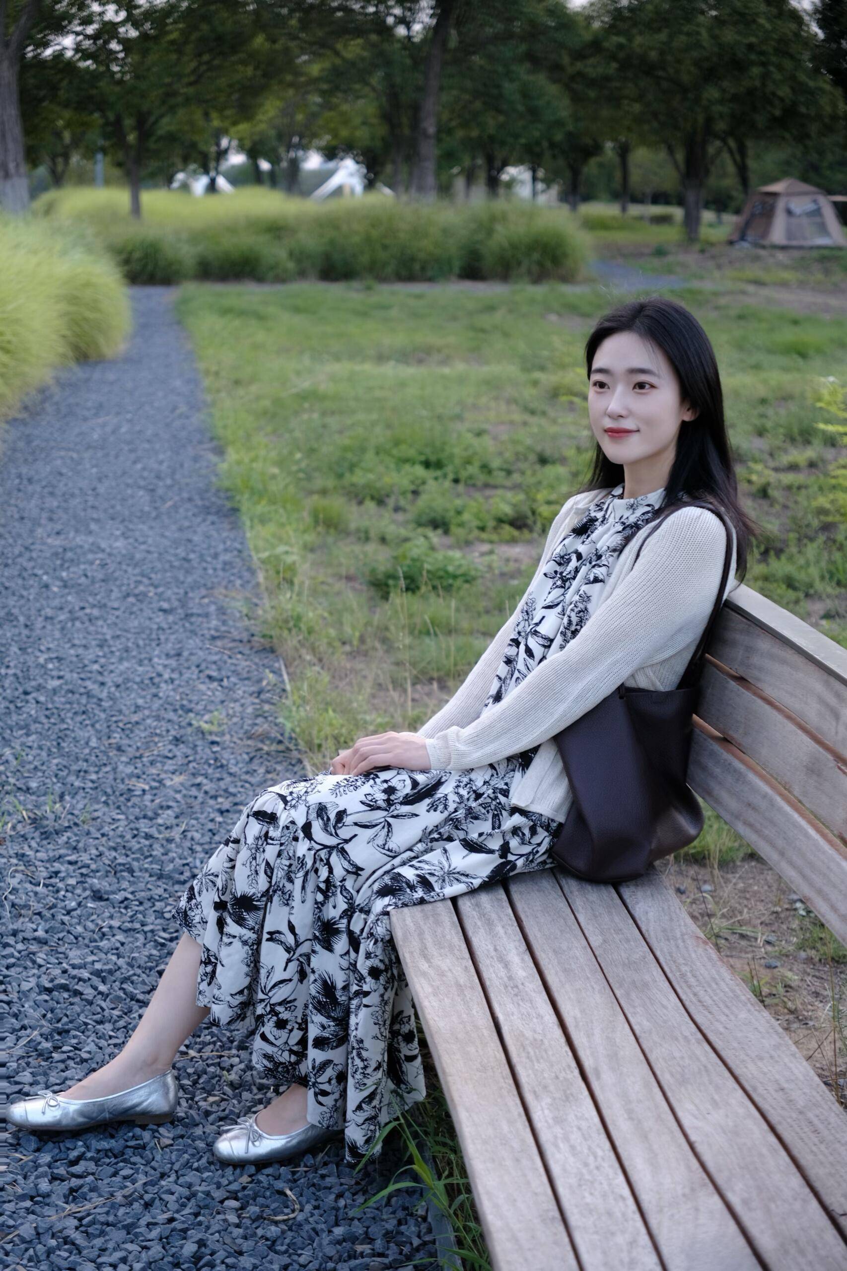 得闲前往公园,米白色针织开衫敞开,内里黑白印花连衣裙上的枝叶图案与身后绿意呼应。坐在木质长椅上,银色平底鞋轻点地面,深棕手提包沉稳相伴。碎石小径蜿蜒,草地青翠,知性气质与自然生机交融,读书或发呆皆是身心滋养。