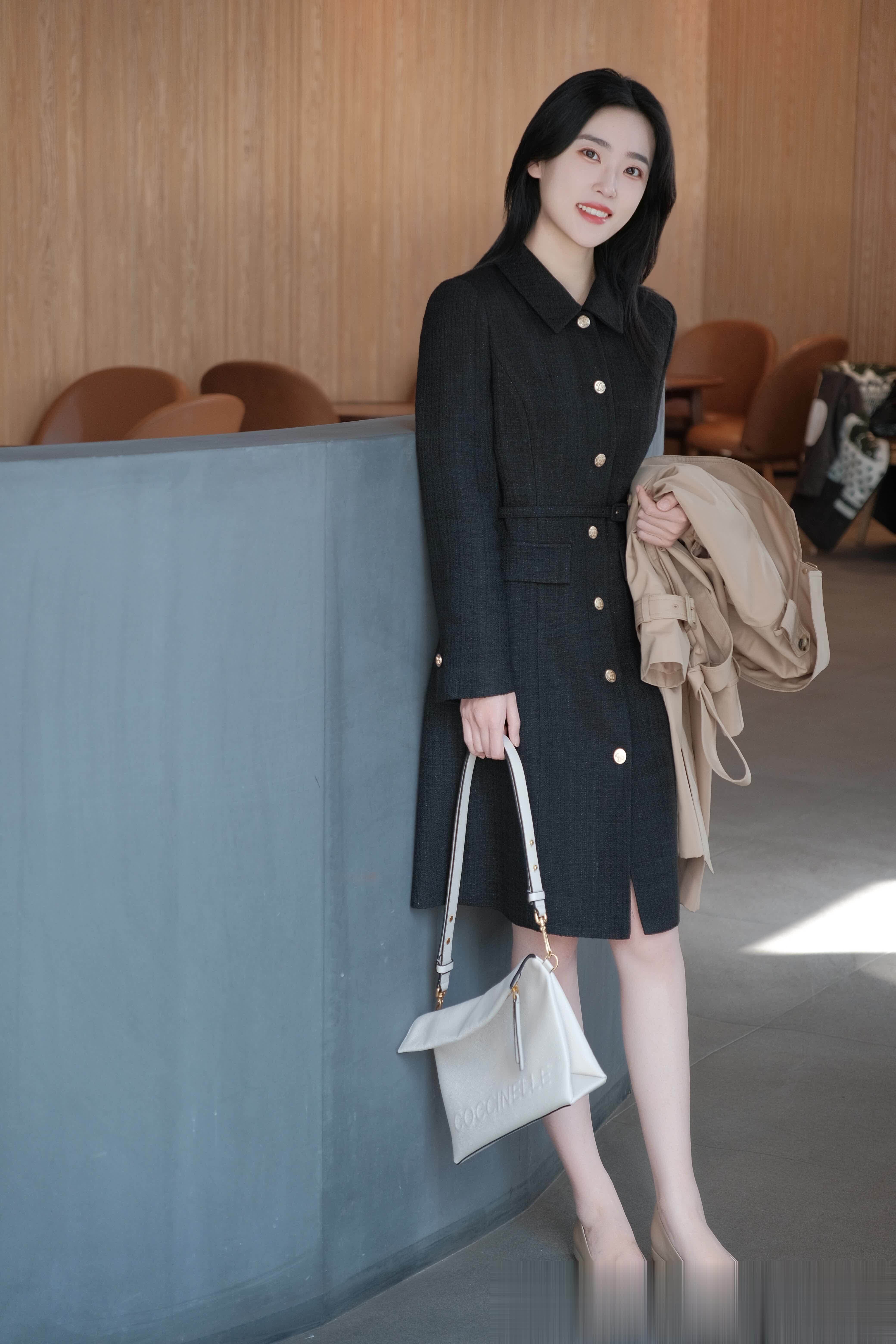 出差前在酒店大堂稍作停留。深色修身连衣裙,以金色纽扣与腰带强调专业轮廓,沉稳有力。手臂上搭着的浅卡其色风衣,兼具应对多变天气的智慧与洒脱。手提白色通勤包,脚踩舒适浅口鞋。身后木质的温暖与椅子的秩序感,烘托出即将启程的利落与优雅。